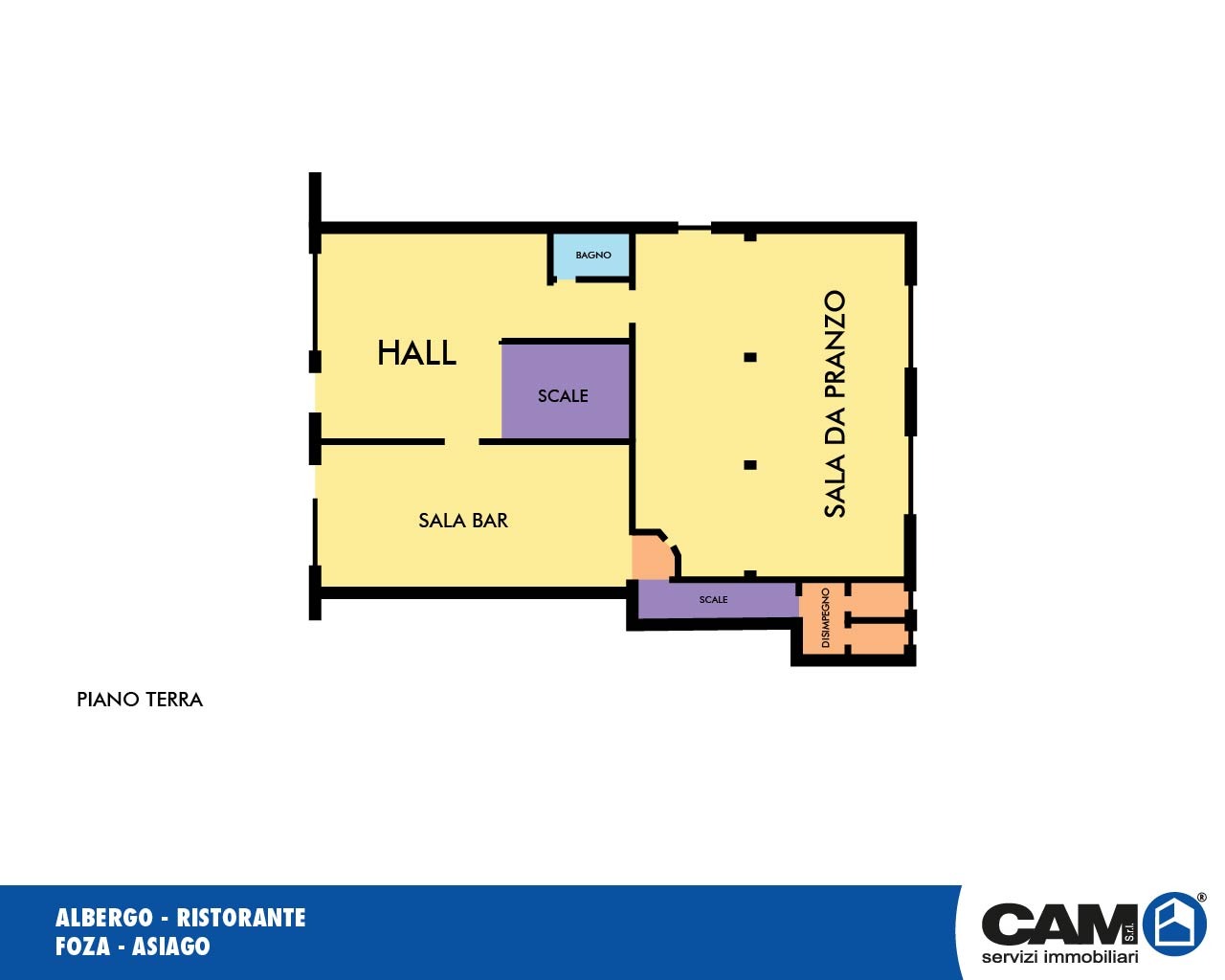 Hall, sala bar, sala ristorante e servizi igienici.