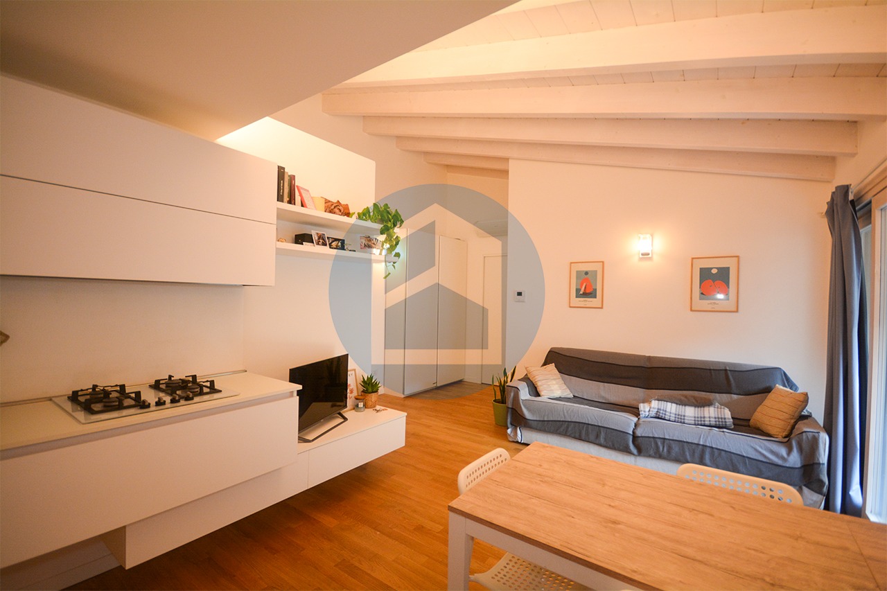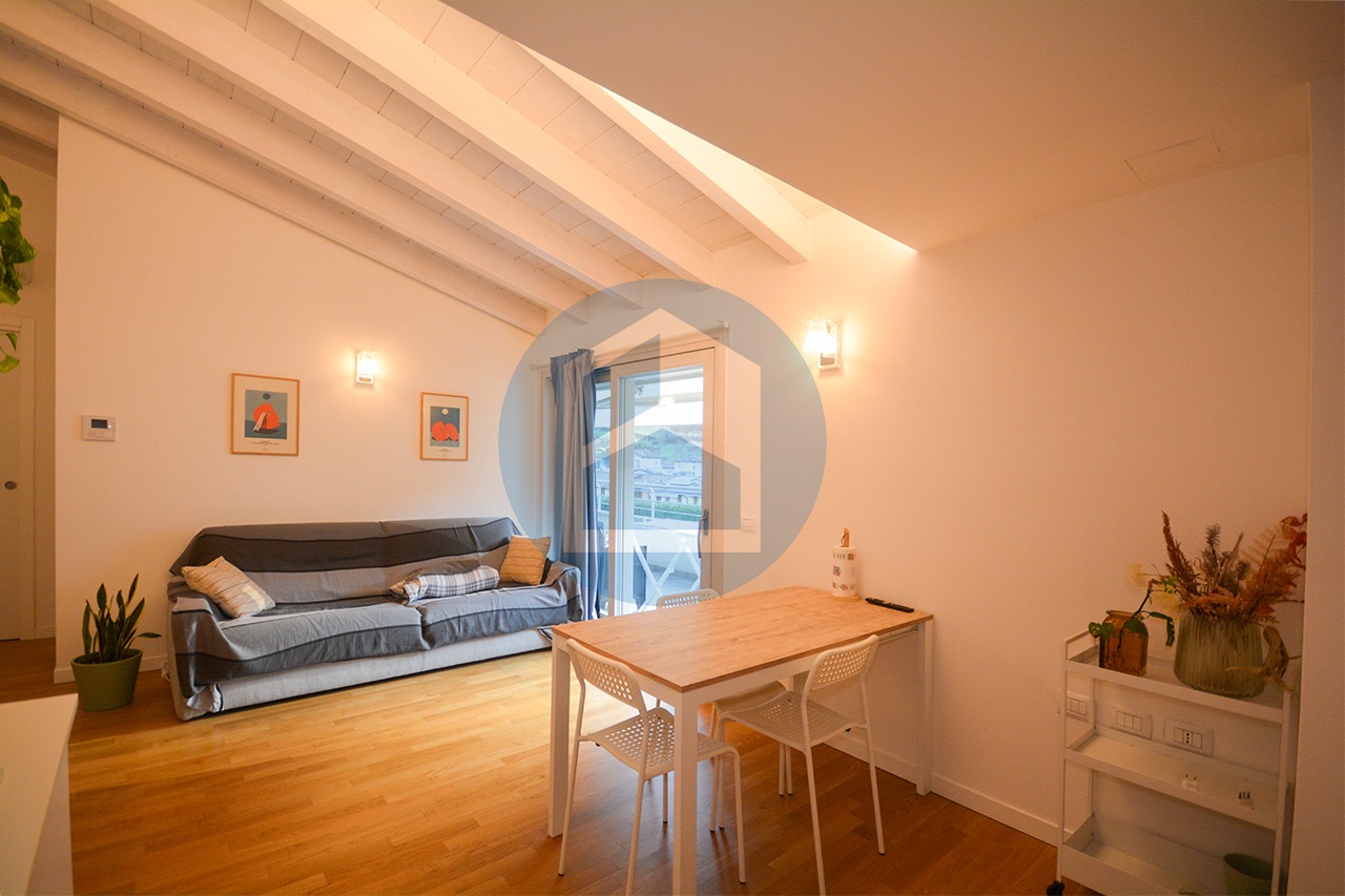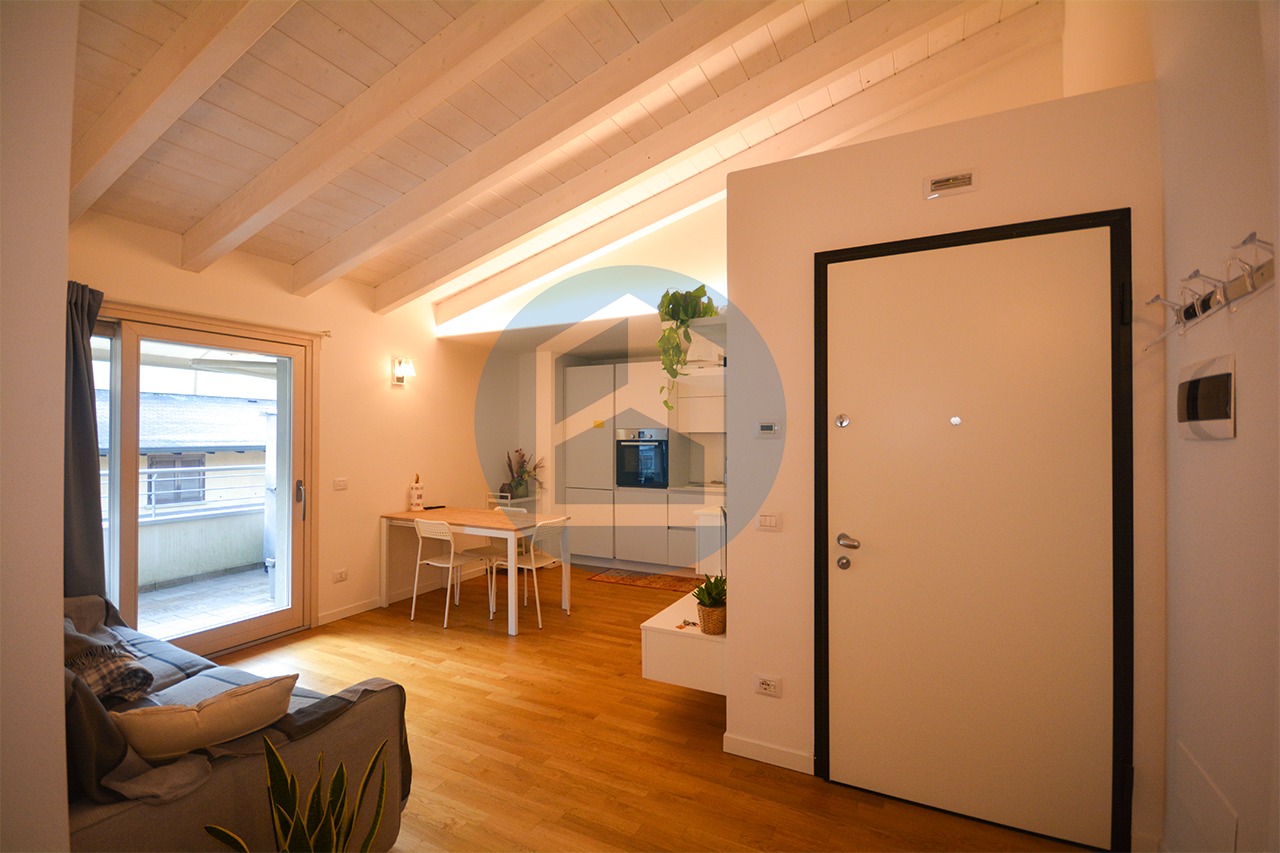 Luminoso appartamento bilocale con travi a vista composto da open space con angolo cottura, disimpegno, bagno e camera da letto matrimoniale oltre ad ampio terrazzo.