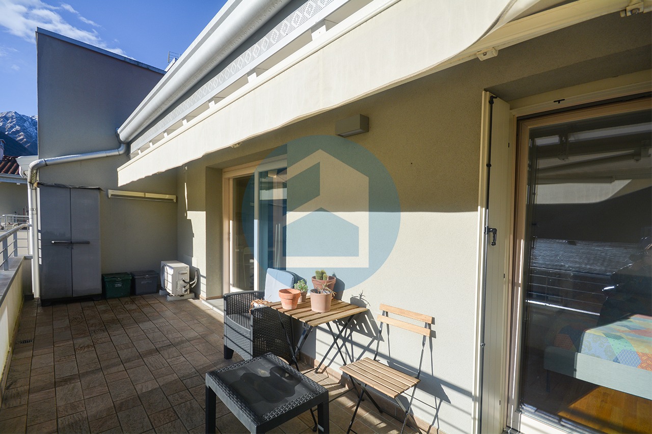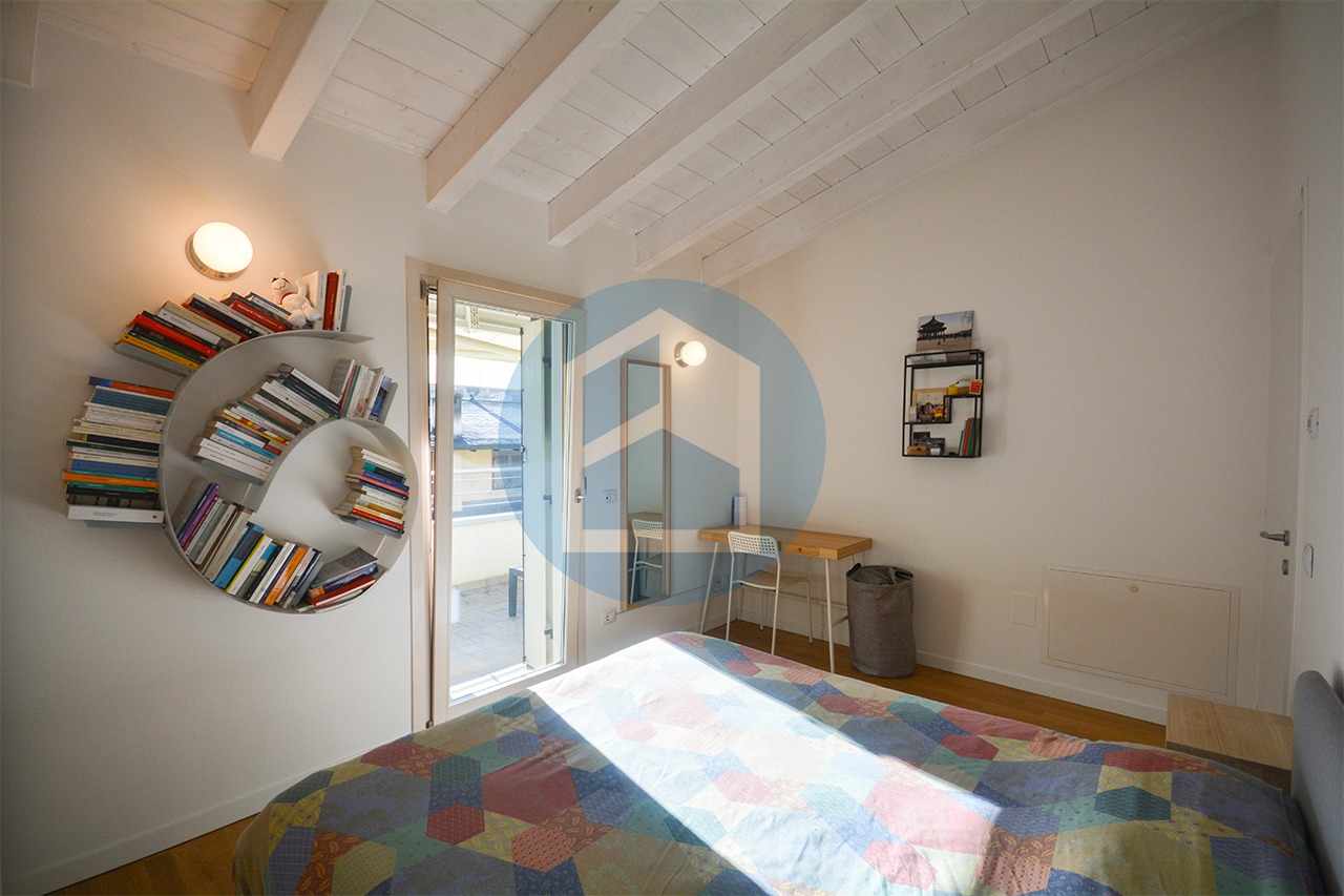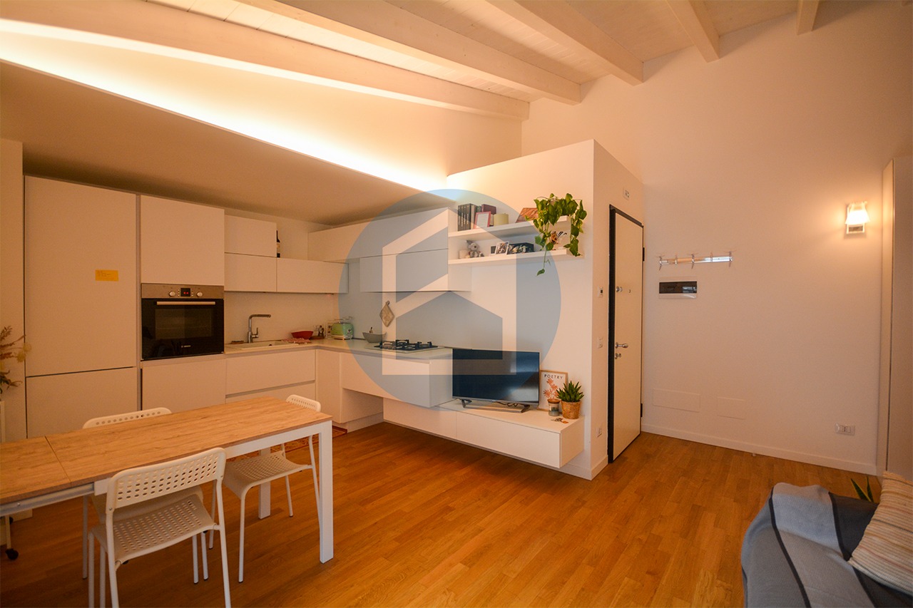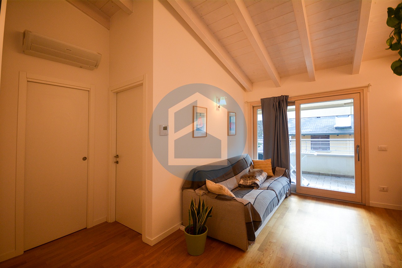 Luminoso appartamento bilocale con travi a vista composto da open space con angolo cottura, disimpegno, bagno e camera da letto matrimoniale oltre ad ampio terrazzo.