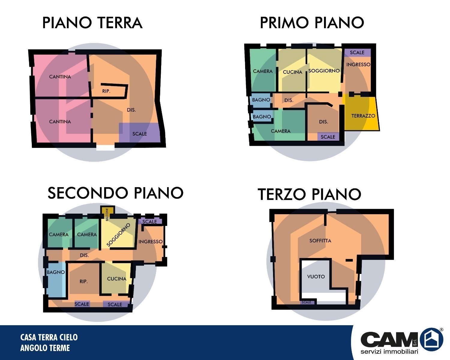 Ad Angolo Terme, in zona centrale e molto ben esposta, nelle vicinanze dei principali servizi, casa singola, libera su tre lati e sviluppata su quattro livelli completamente da ristrutturare.