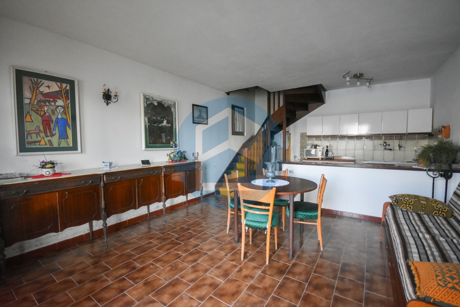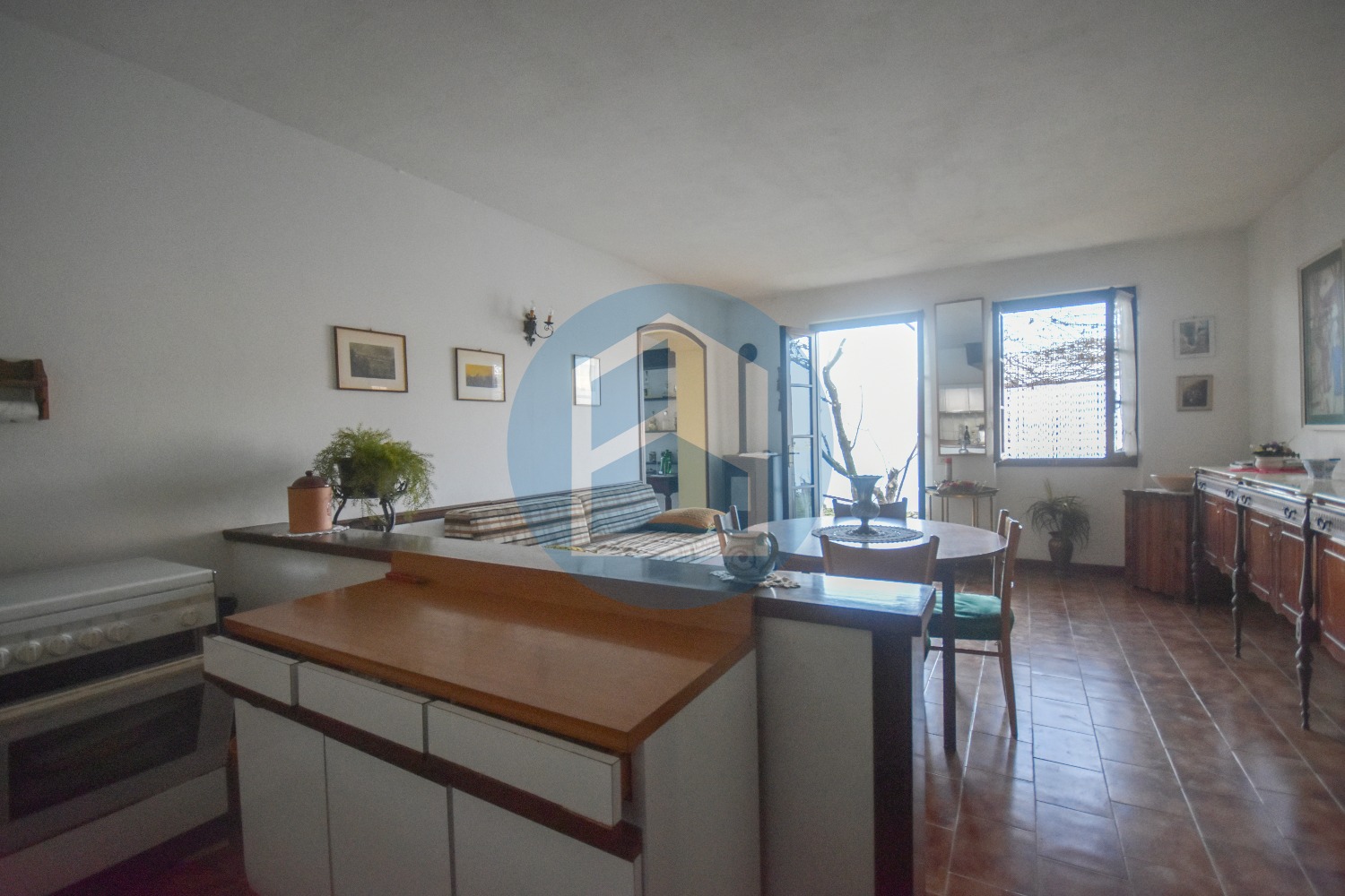Zona giorno con cucina a vista, salotto con portafinestra che consente un accesso diretto al portico con vista.