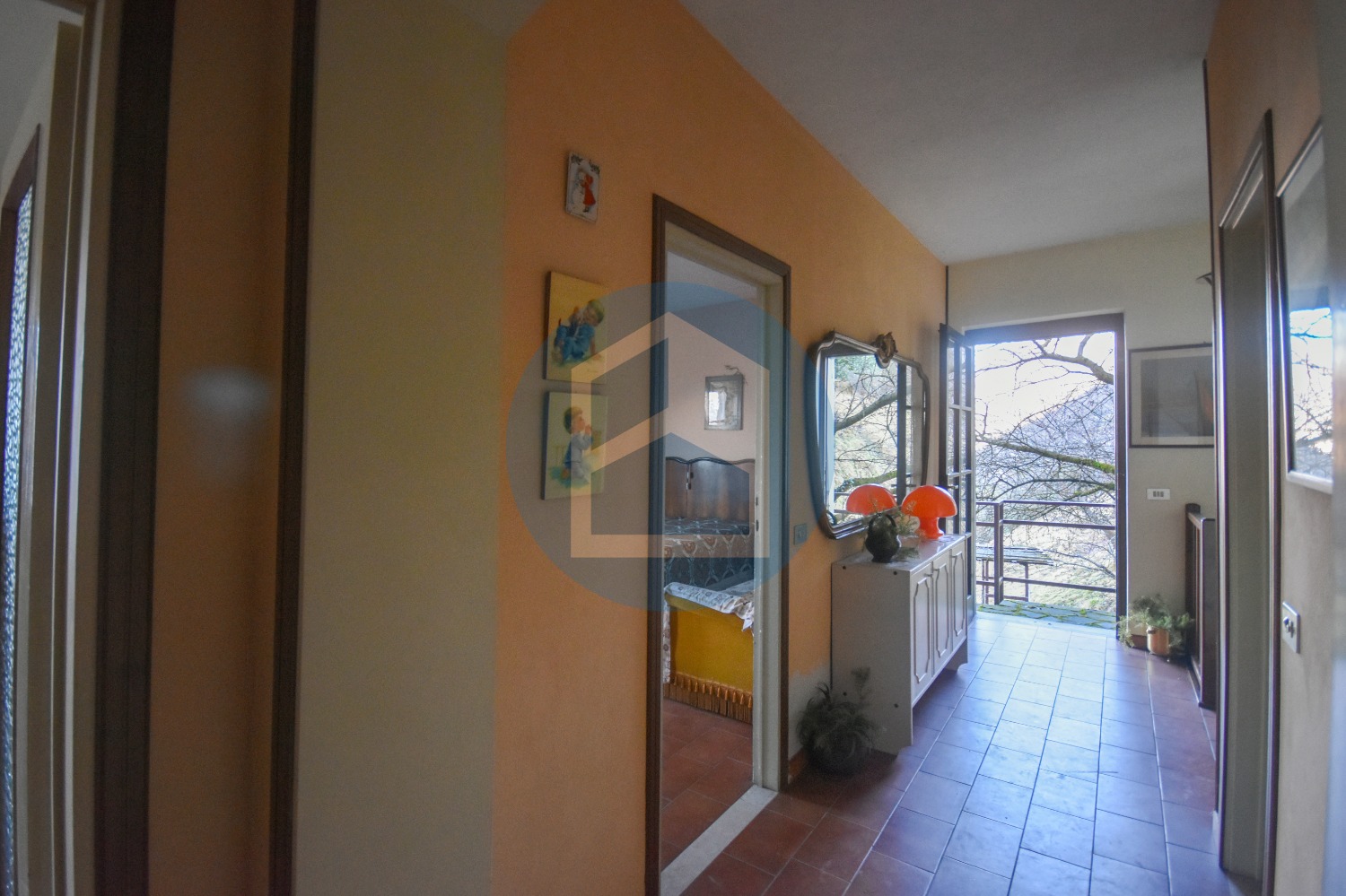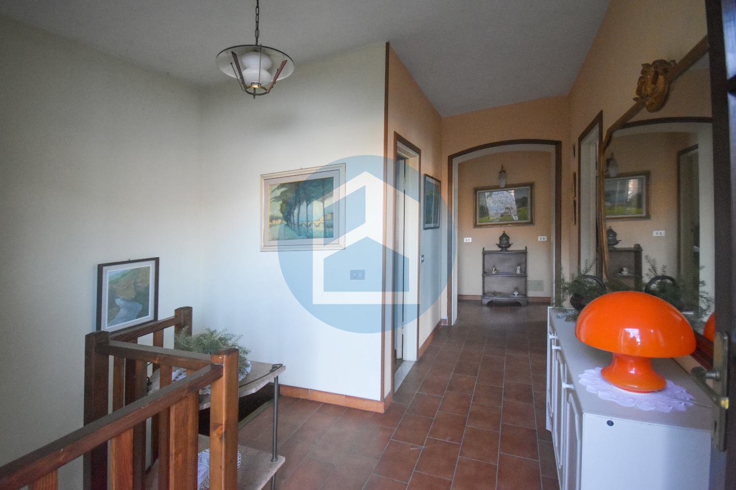 La zona notte, raggiungibile direttamente dal salotto tramite scala a chiocciola, presenta da un lato tre camere da letto, due delle quali con vista lago, e un bagno; dall’altro troviamo altre due stanze ed un bagno. Al piano primo presente anche porzione di fienile con accesso differenziato.
