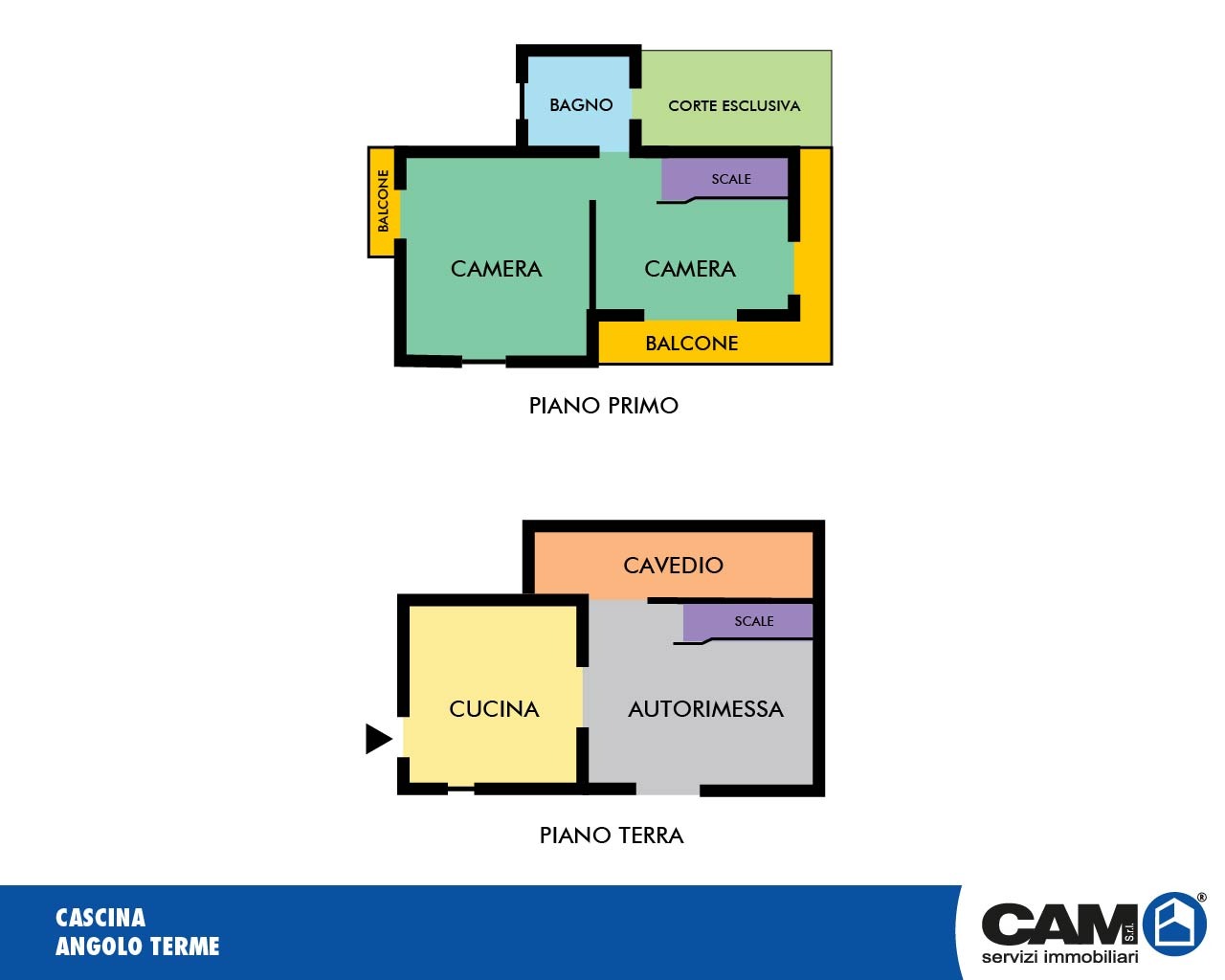 – Piano primo (terra) composto da due camere ed un bagno, terrazza e balcone.