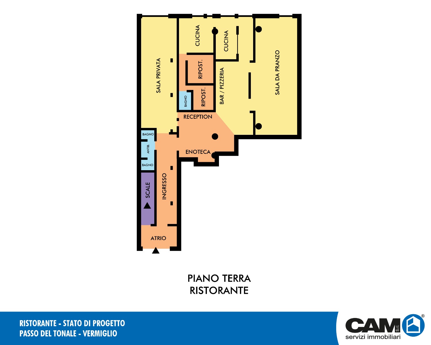 Nel progetto di riqualificazione risulta composto dai seguenti vari ambienti: attraversando l’atrio e l’ingresso si viene accolti dall’area Reception & Enoteca la qual conduce, poi, alla grande zona living dotata di angolo Bar/Pizzeria, due locali cucina e la grande sala da pranzo open space.