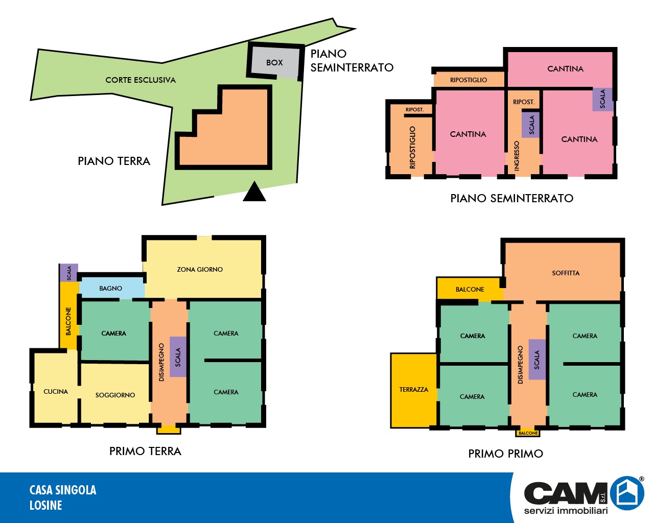 Completano la proprietà un grande e recente box auto in corpo staccato di circa 80,00 mq. oltre a giardino e corte esterna cintati di circa 500,00 mq..