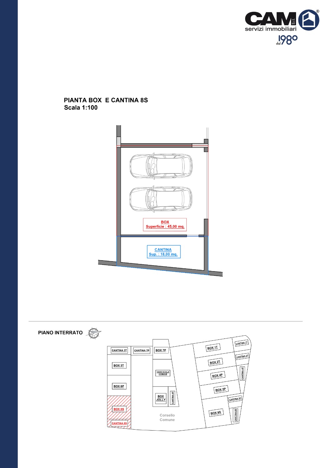 Completano l’immobile al Piano Interrato: box auto doppio di mq. 45,00 ca. perfetto sia per chi possiede due vetture sia per chi desidera utilizzare uno spazio come deposito per biciclette o attrezzi, oltre a una cantina di mq. 18,00 ca. che offre ulteriore spazio di stoccaggio.