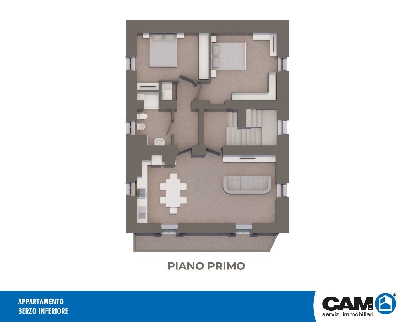 Costituito da ampia zona living con balcone di 9 mq ca., disimpegno, bagno e due camere da letto.