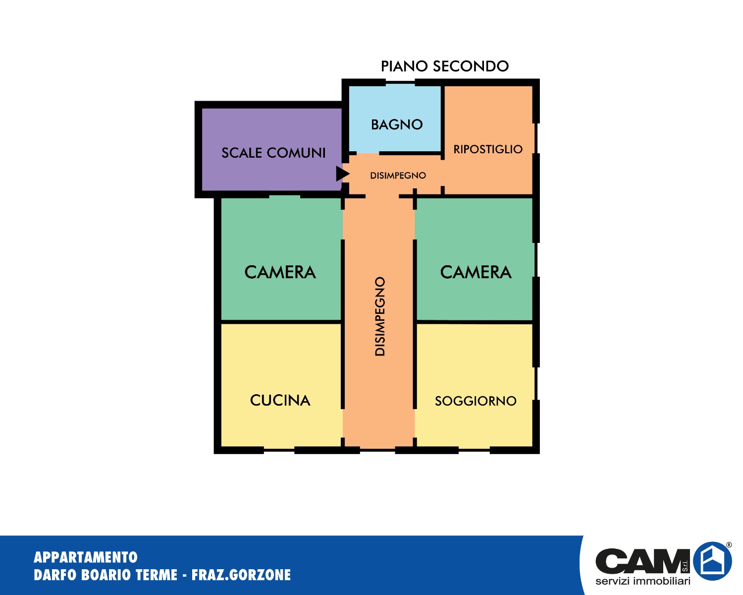 L’appartamento è composto da una cucina abitabile, un luminoso soggiorno dotato di caminetto, due ampie camere da letto ed un ripostiglio, utilizzabile anche come terza cameretta.