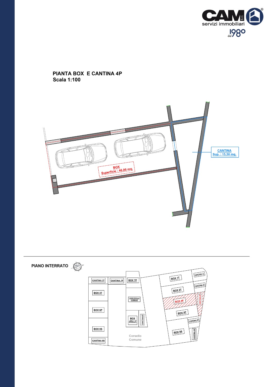 Completano l’immobile al Piano Interrato: box auto doppio di mq. 46,00 ca. perfetto sia per chi possiede due vetture sia per chi desidera utilizzare uno spazio come deposito per biciclette o attrezzi, oltre a una cantina di mq. 15,50 ca. che offre ulteriore spazio di stoccaggio.