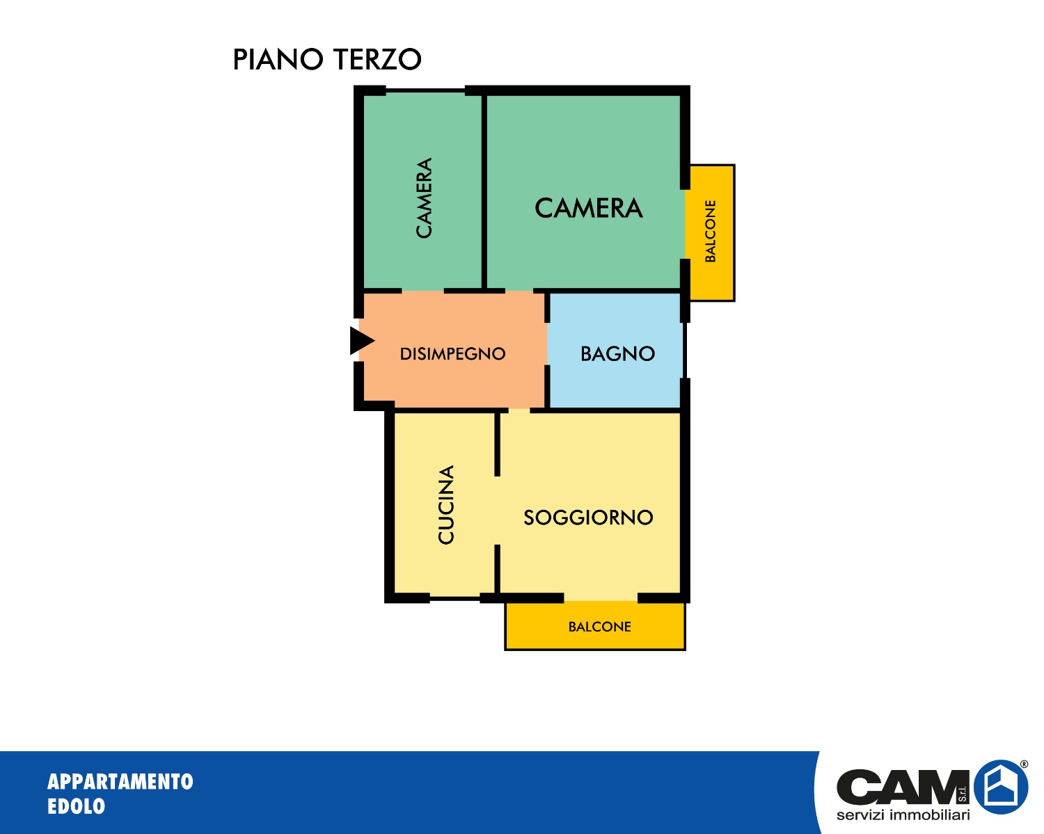 Completano il piano due balconi, il primo con accesso dal soggiorno affacciato sull’abitato di Edolo, il secondo con accesso dalla camera matrimoniale.