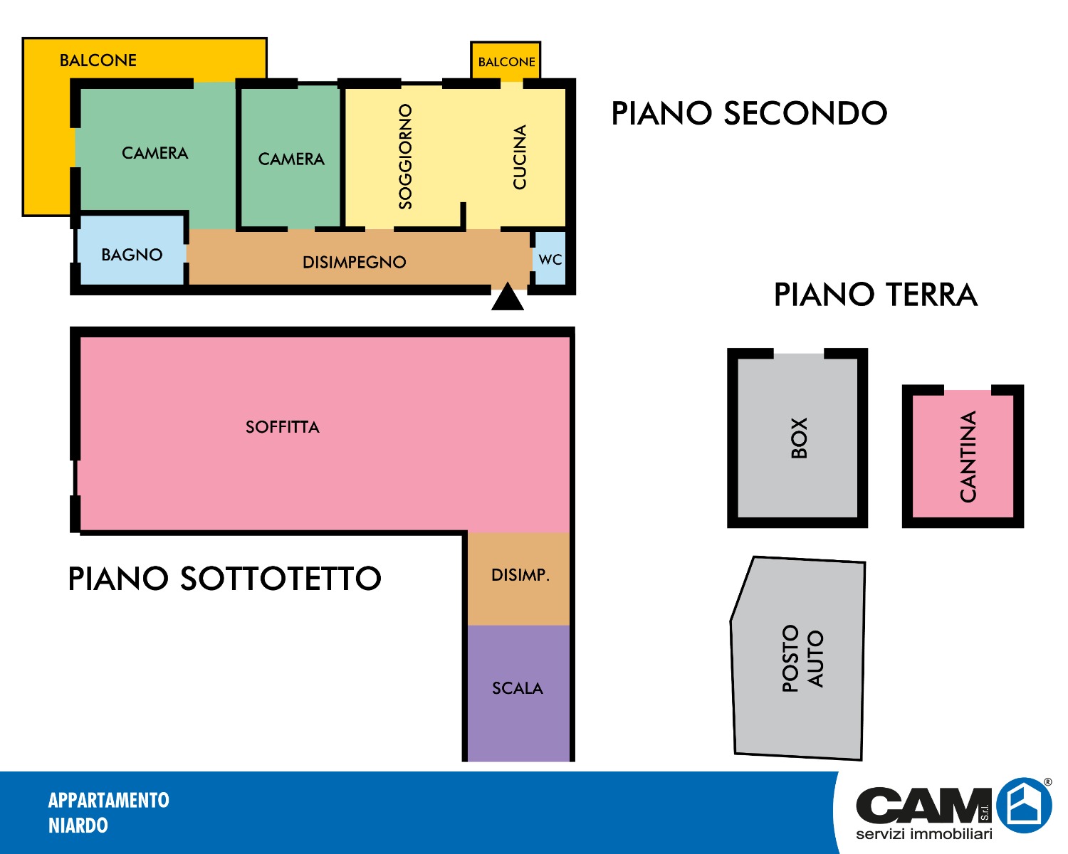 L’immobile è composto da soggiorno, cucina da cui si accede al balcone, disimpegno, servizio della zona giorno, camera matrimoniale con balcone, camera singola e bagno finestrato della zona notte; al piano superiore sottotetto esclusivo ripostiglio/deposito di mq. 97,00 ca..