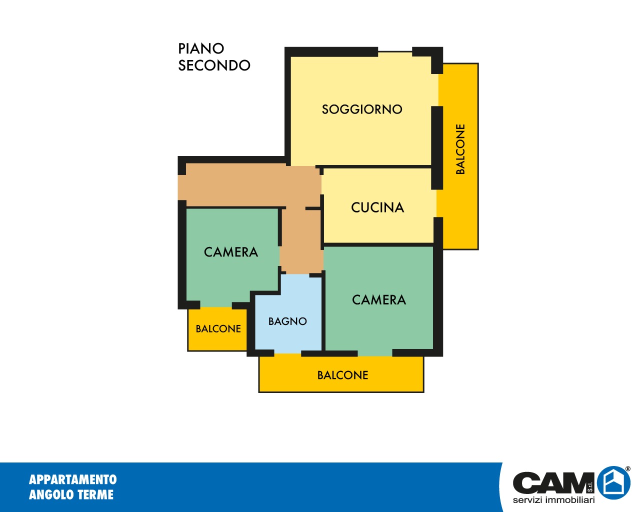 L’immobile è così composto: ingresso, soggiorno con camino, cucina abitabile entrambi con accesso a balcone, 2 camere entrambe con balcone e bagno finestrato.