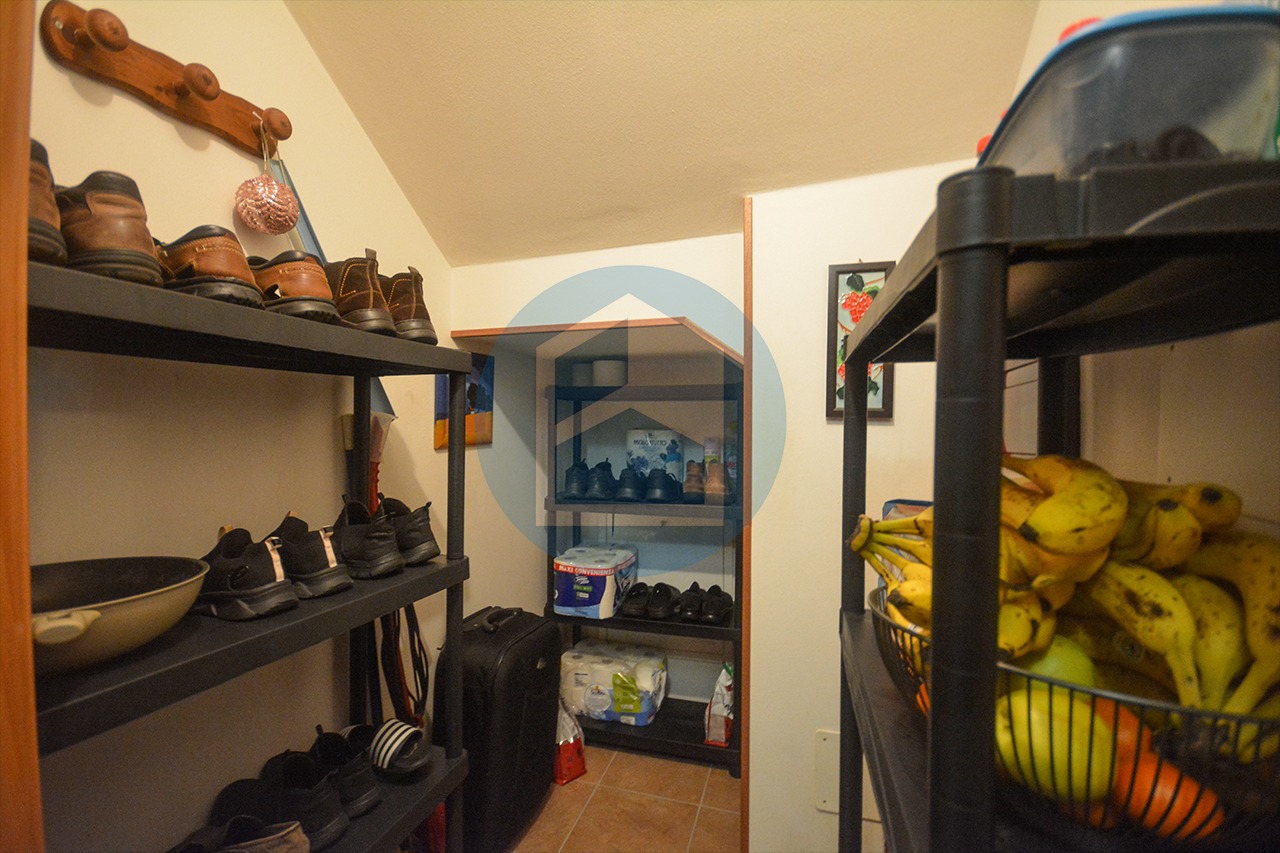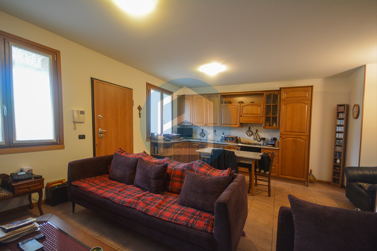 La zona giorno, luminosa e ben distribuita, si compone di soggiorno con cucina a vista, un bagno di servizio e un comodo ripostiglio.