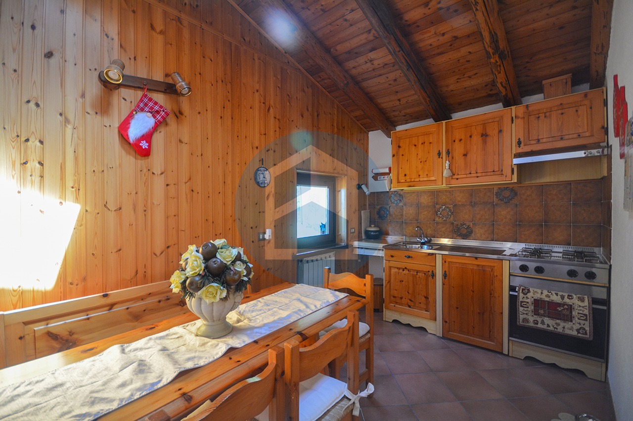 Spaziosa zona giorno dal sapore montano, con cucina moderna ad isola, ampio salotto con camino, forno per le pizze e accesso diretto al giardino privato di mq. 250 ca. tramite una grande porta finestra panoramica con vista aperta sulla Valcamonica.