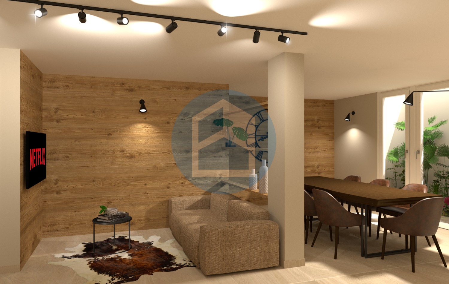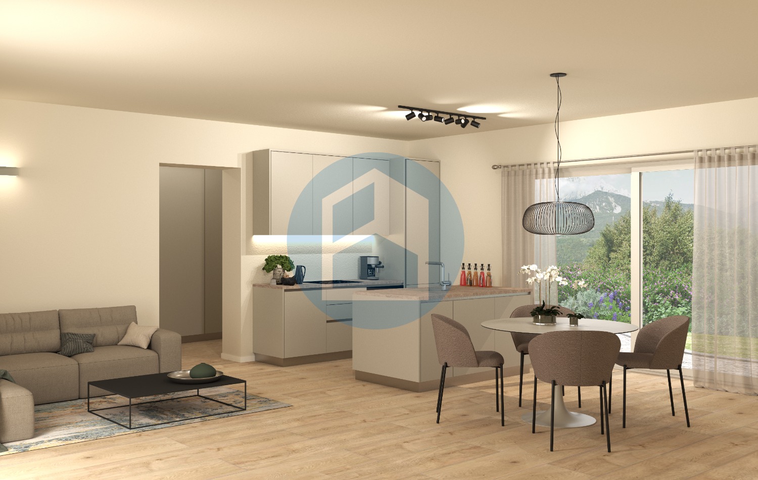 Costituito dalla zona giorno composta da soggiorno, illuminato dalle porte finestre che danno direttamente sul giardino e sfruttabile come area divani, dall’angolo cottura composto da zona cucina e da un comodo bagno.