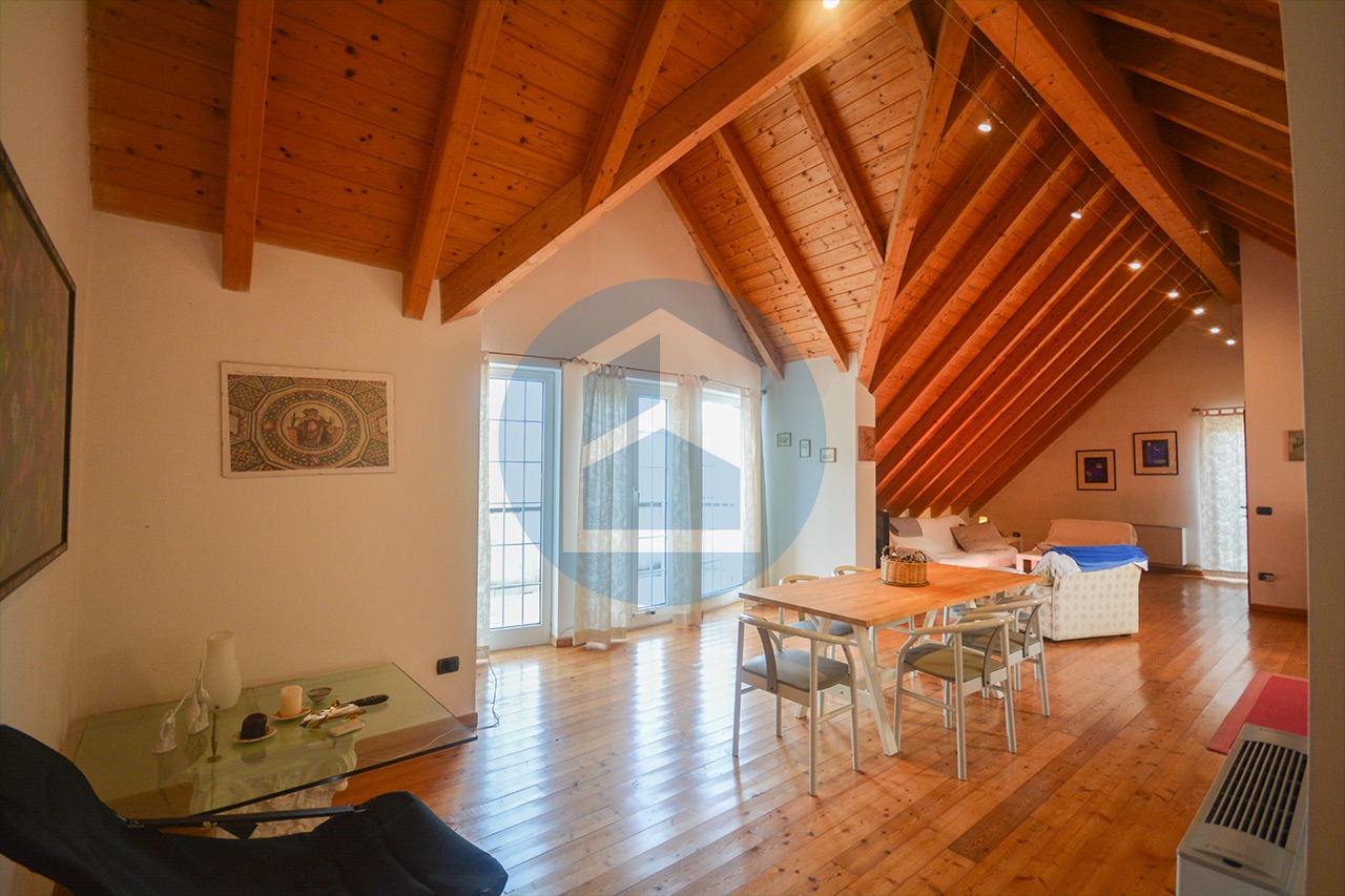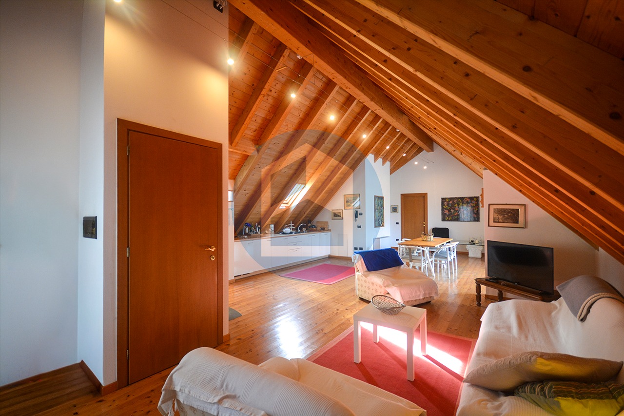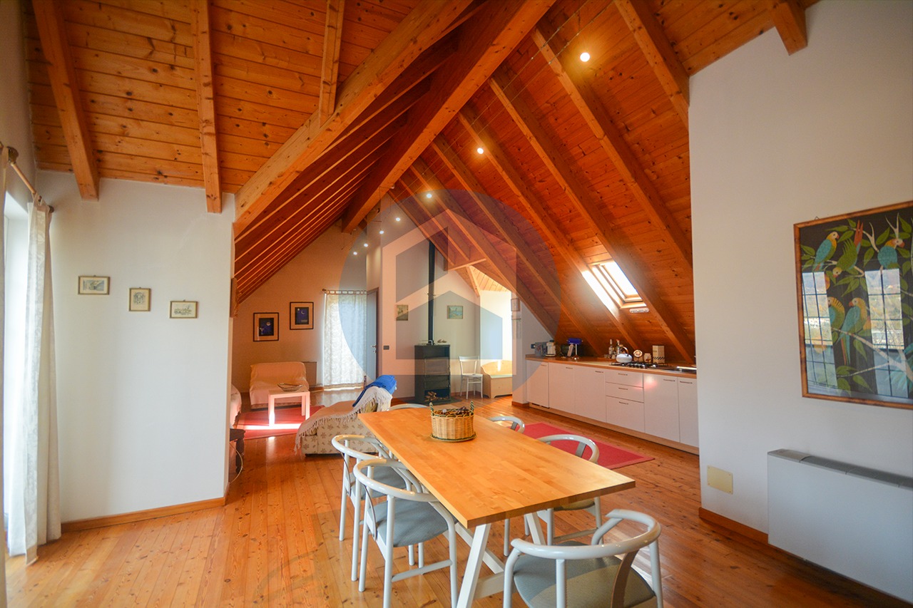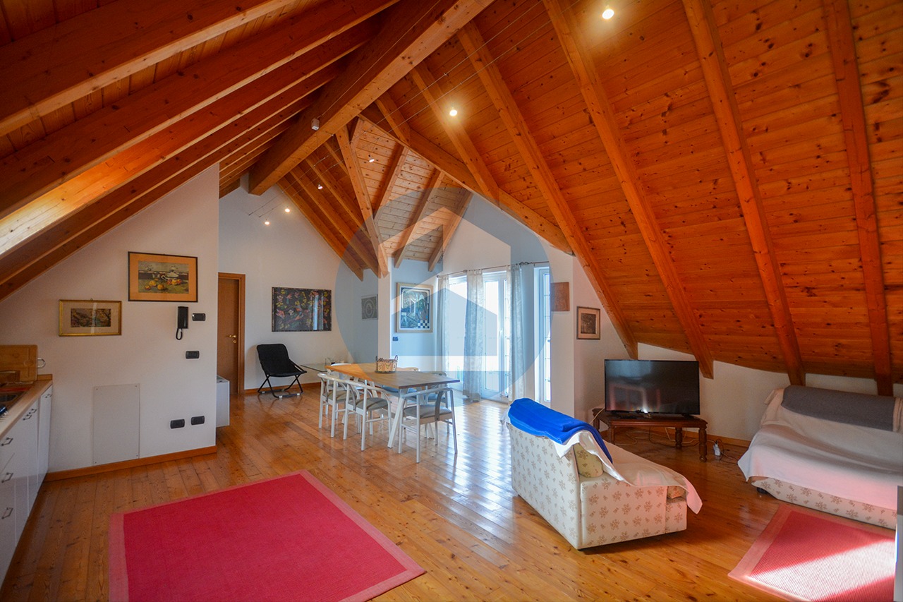 Il secondo appartamento, con travi in legno a vista, dispone di una luminosa zona giorno con balcone e cucina a vista.