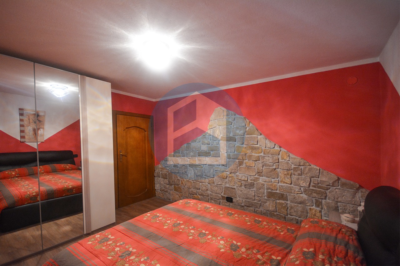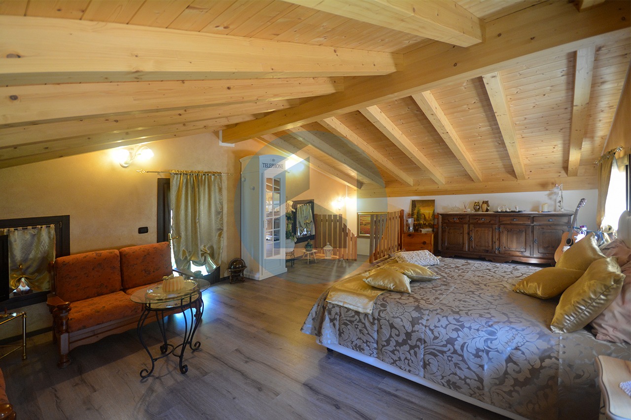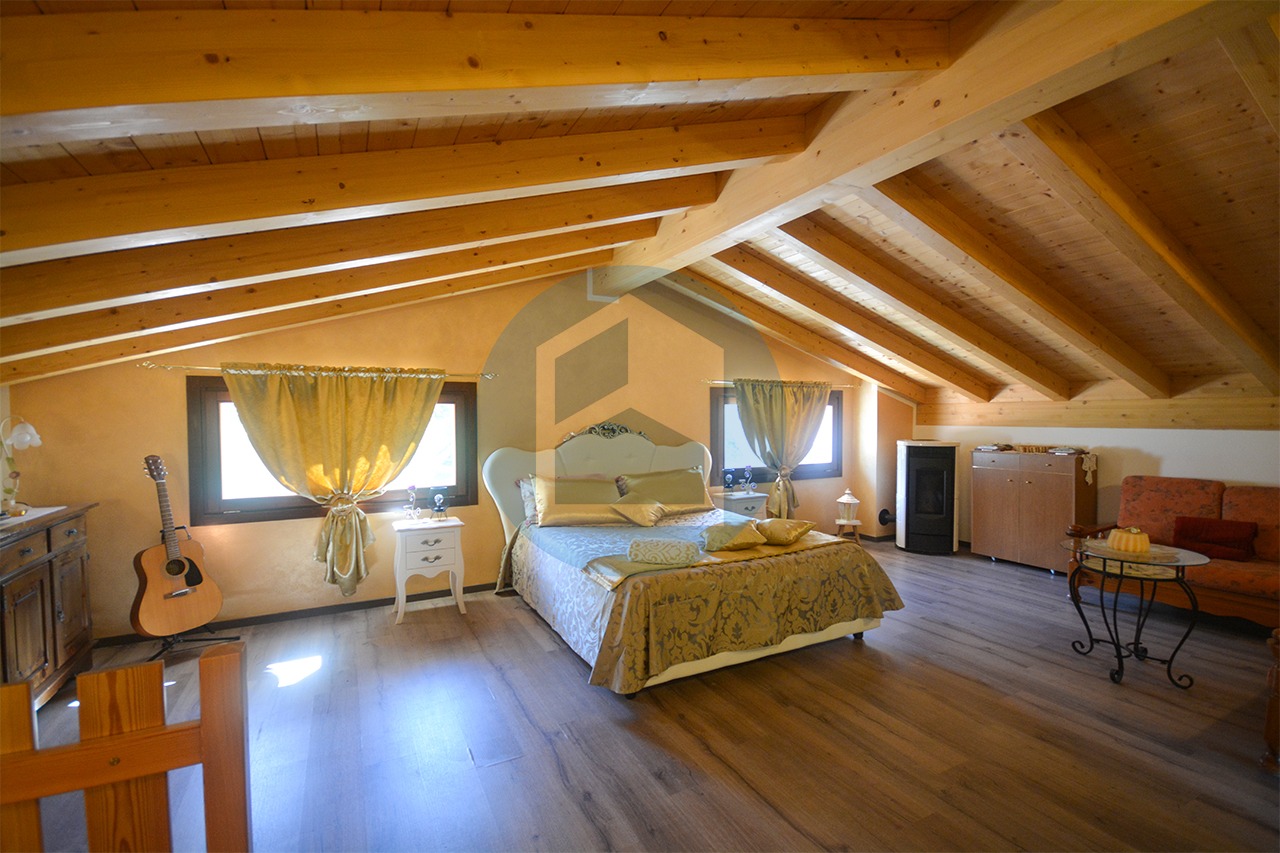 Il primo piano ospita una seconda camera matrimoniale, di ampie proporzioni con uno splendido tetto con legno a vista e che ospita una seconda stufa a pellet. In questo piano, visto le dimensioni molto generose, è possibile realizzare due ambienti divisi, per esempio due camere matrimoniali.