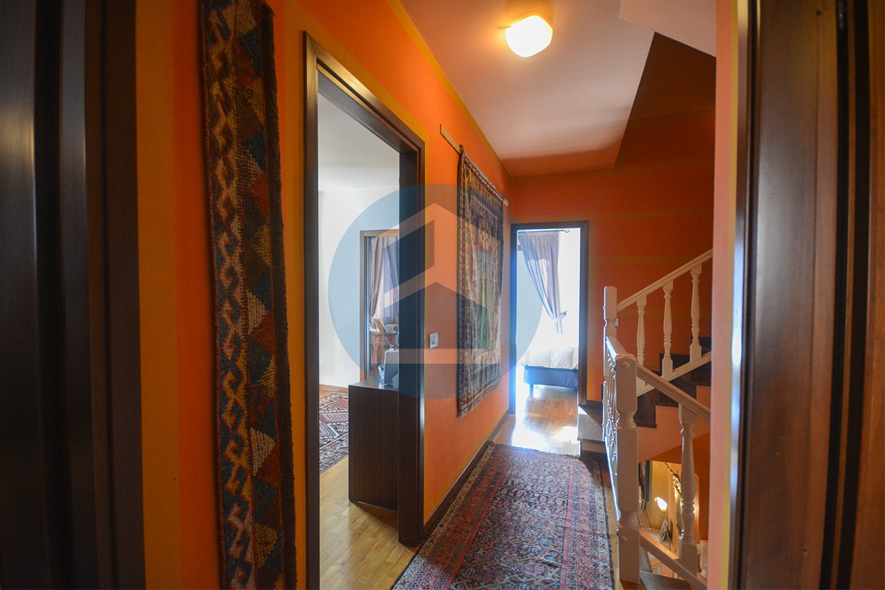 Un’elegante scala interna collega il piano terra al primo piano, dove si sviluppa la zona notte composta da tre camere da letto: due matrimoniali e una cameretta, oggi adibita a cabina armadio, oltre a un bagno. Due camere hanno accesso diretto al terrazzo, ideale per godere di momenti di relax all’aperto con vista aperta e riservata.