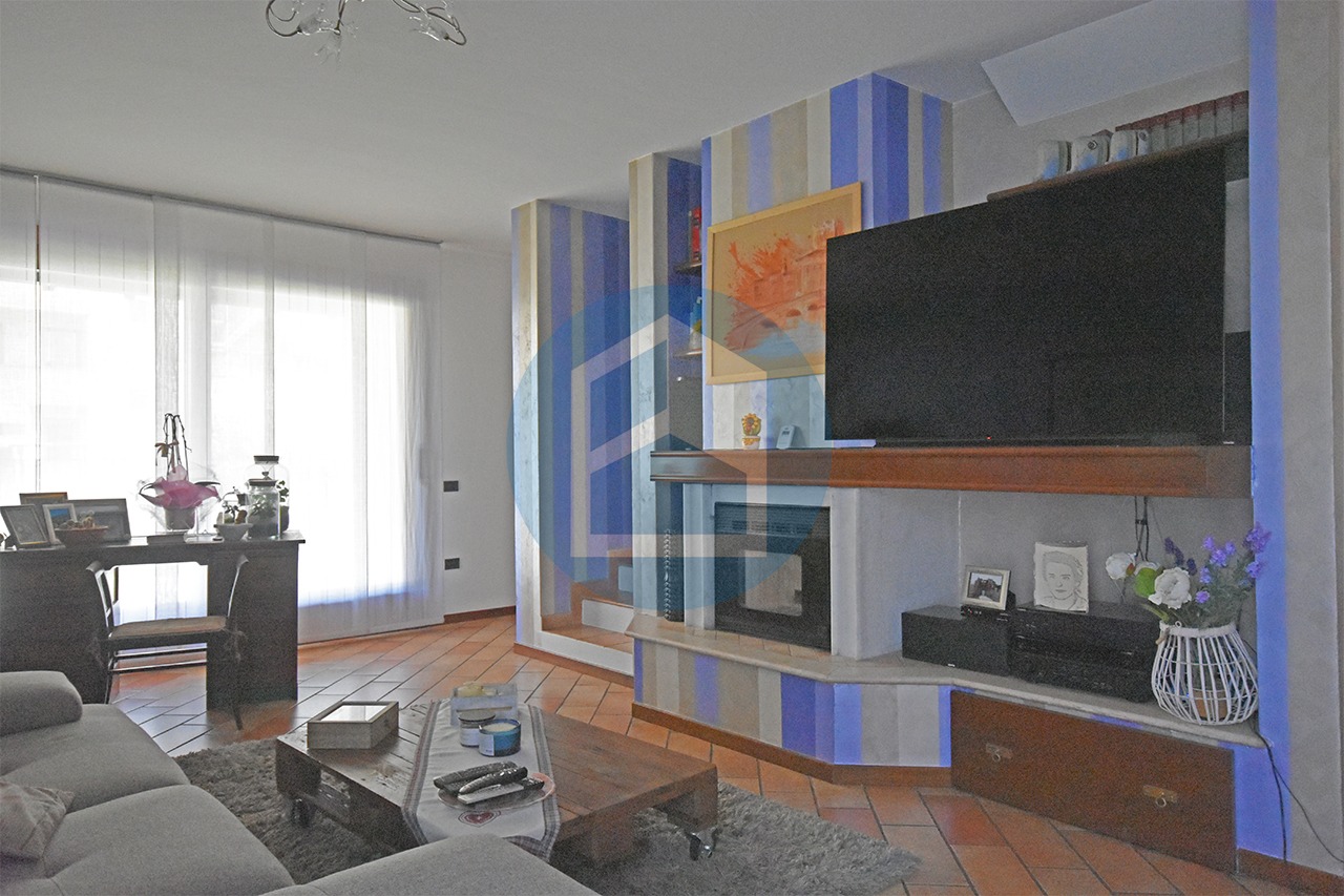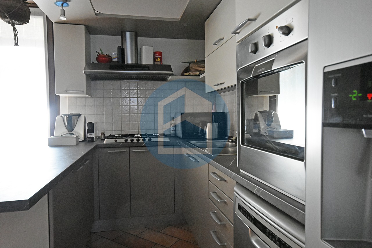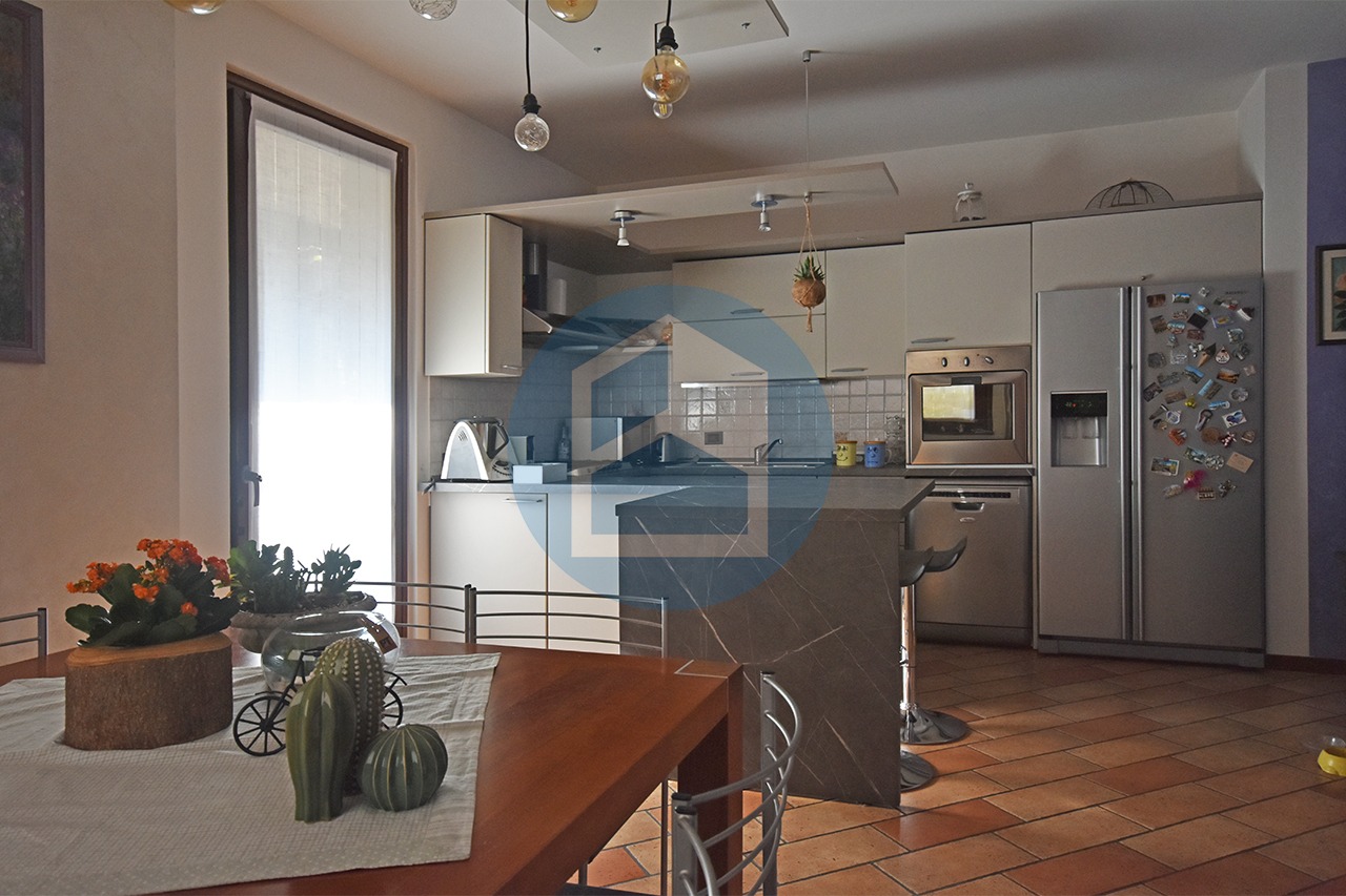 Entrando si passa direttamente alla zona cucina, illuminata dalla porta finestra che affaccia sul balcone di mq. 28 ca, composta da attrezzata zona cottura con isola e tavolo da pranzo recente e moderna, oppure si accede al collegato soggiorno, illuminato dalla porta finestra che riceve la luce dal porticato affacciato sul giardino, sfruttabile come area divani, tv e relax.