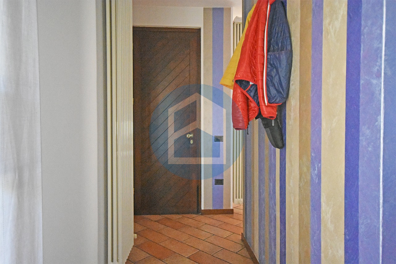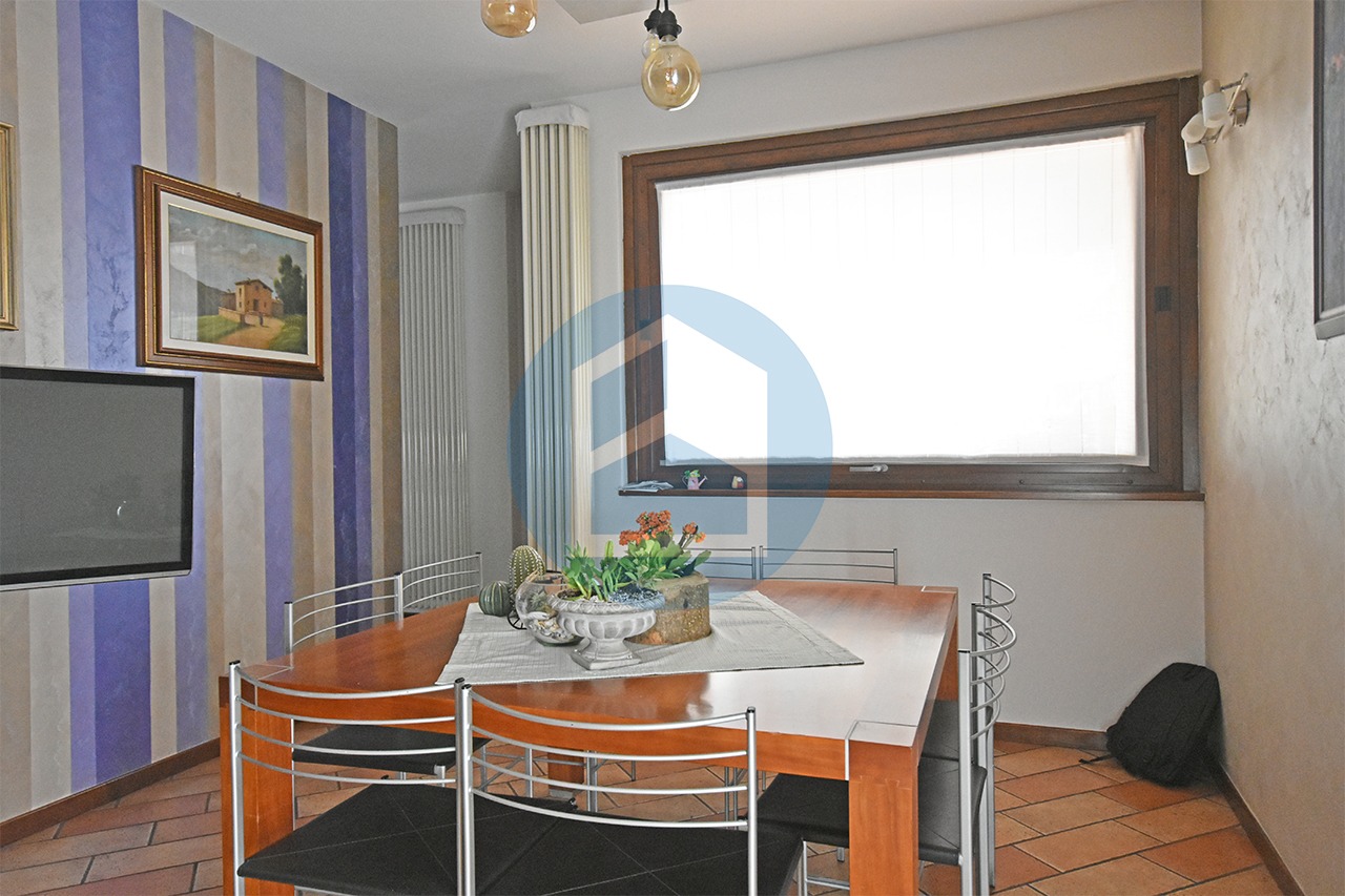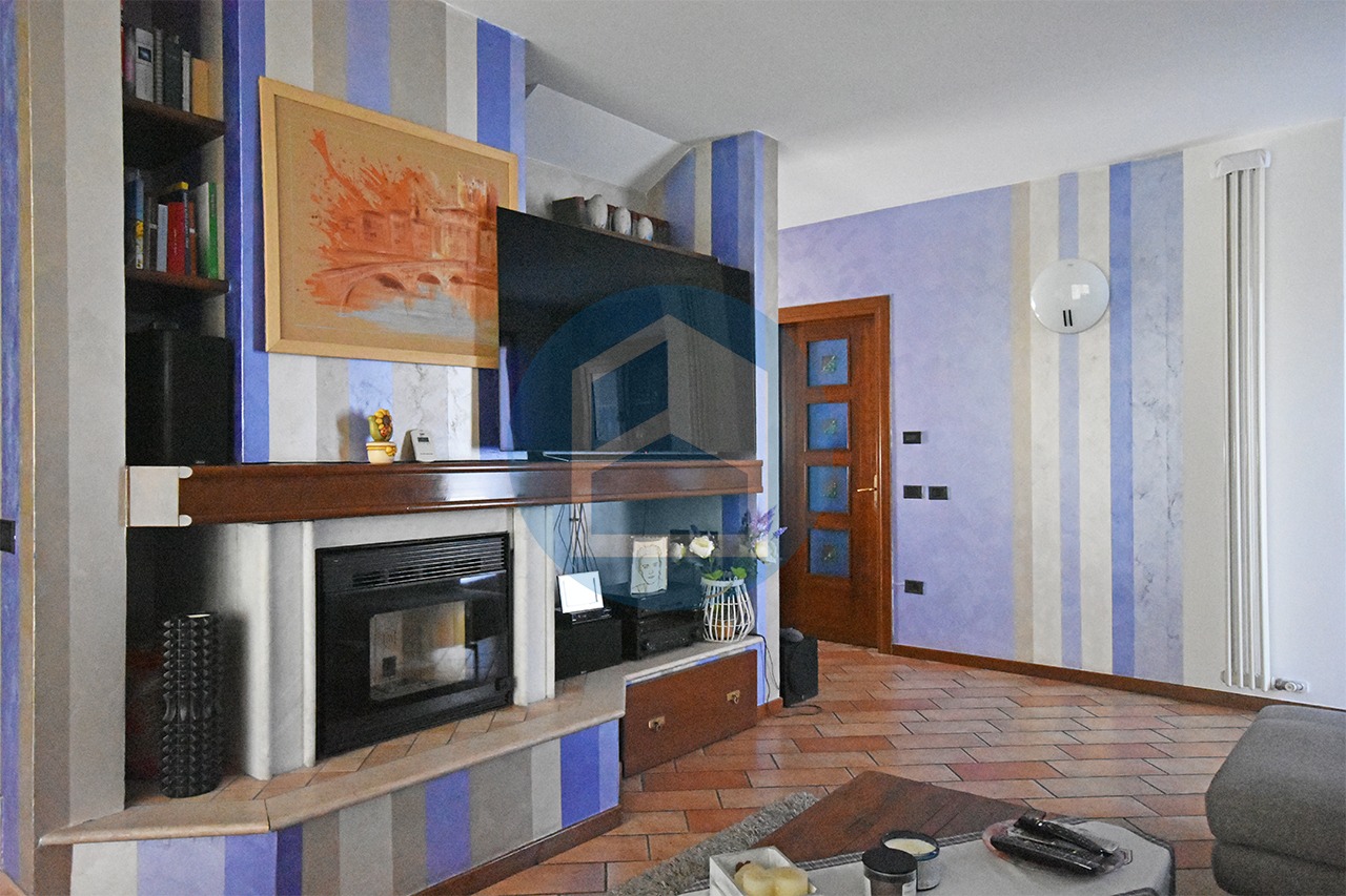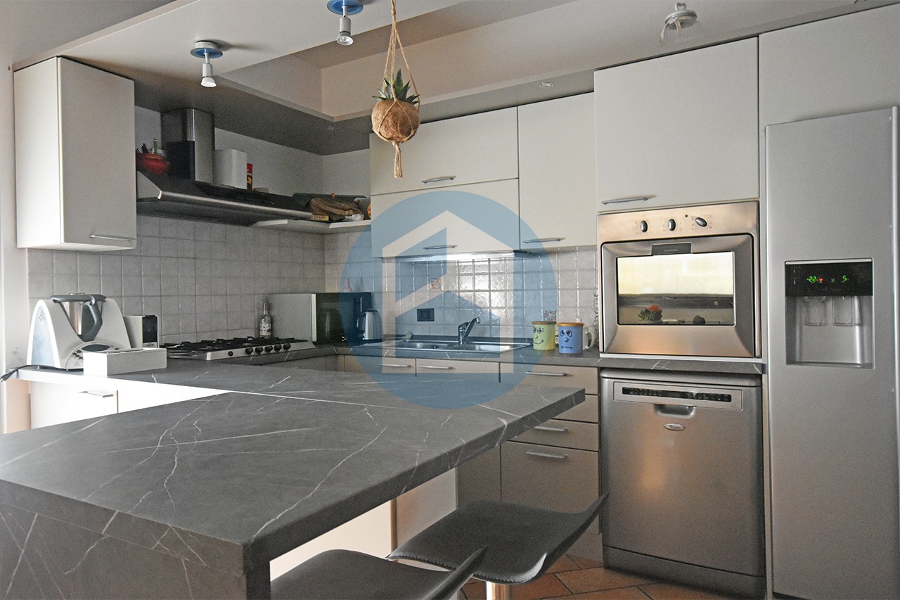 Entrando si passa direttamente alla zona cucina, illuminata dalla porta finestra che affaccia sul balcone di mq. 28 ca, composta da attrezzata zona cottura con isola e tavolo da pranzo recente e moderna, oppure si accede al collegato soggiorno, illuminato dalla porta finestra che riceve la luce dal porticato affacciato sul giardino, sfruttabile come area divani, tv e relax.