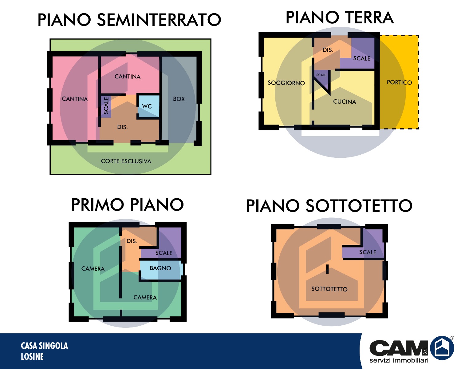 A Losine, in un contesto completamente immerso nel verde, nella zona di nuova espansione, fabbricato tipo cascina, libero su quattro lati, sviluppato su quattro livelli tra loro collegati da una scala interna.
